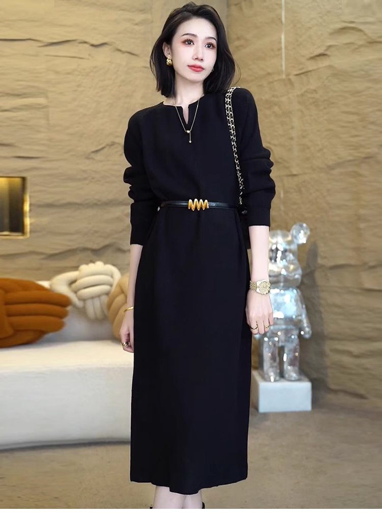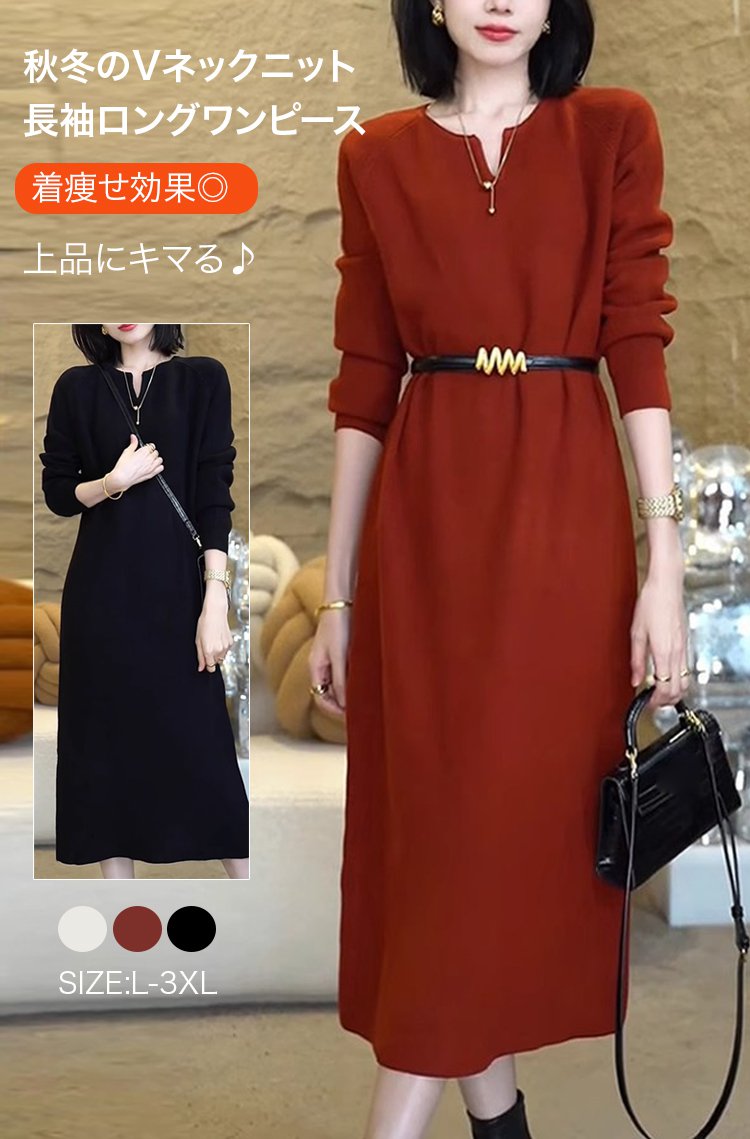 【無地で合わせやすい】秋冬のVネックニット長袖ロングワンピース