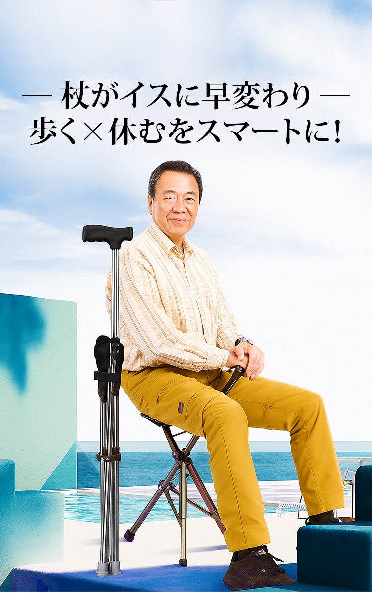 整形外科の専門家が推薦、1秒で椅子に変わる杖、いつでもどこでも休憩可能!140cmから190cmまで対応!