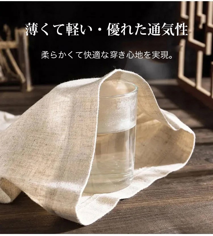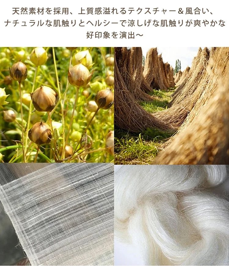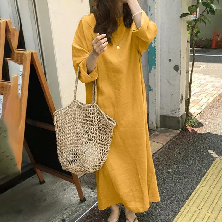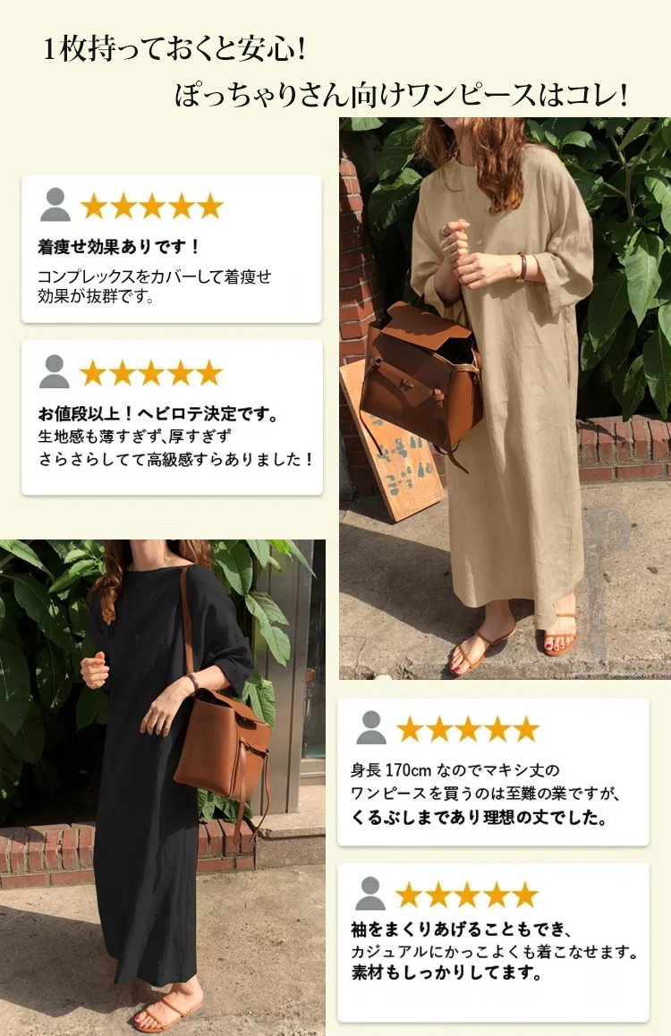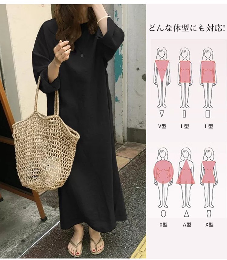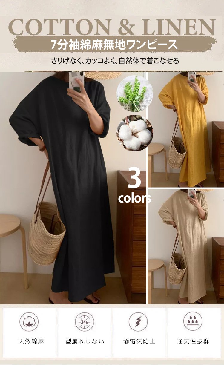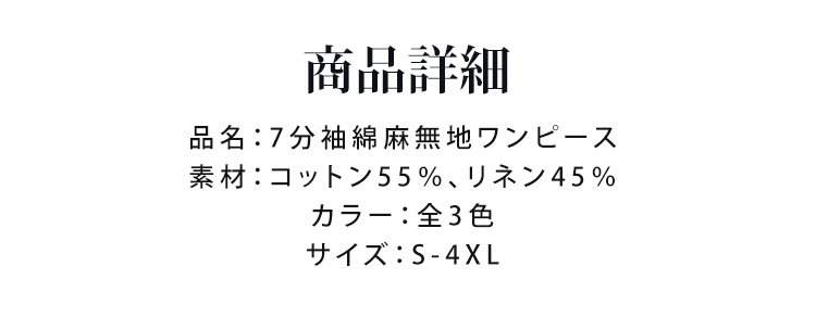 7分袖綿麻無地ワンピース